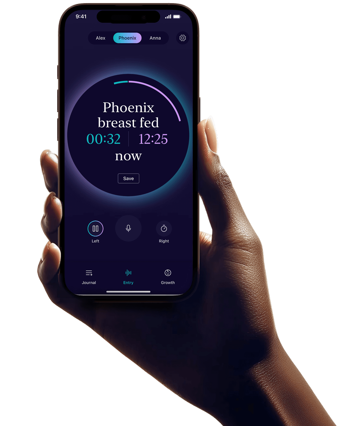 Just tap the microphone and speak naturally: “James had a bottle of 5 ounces at 3pm.” Kiri uses speech recognition and AI to understand your entry and save it instantly.