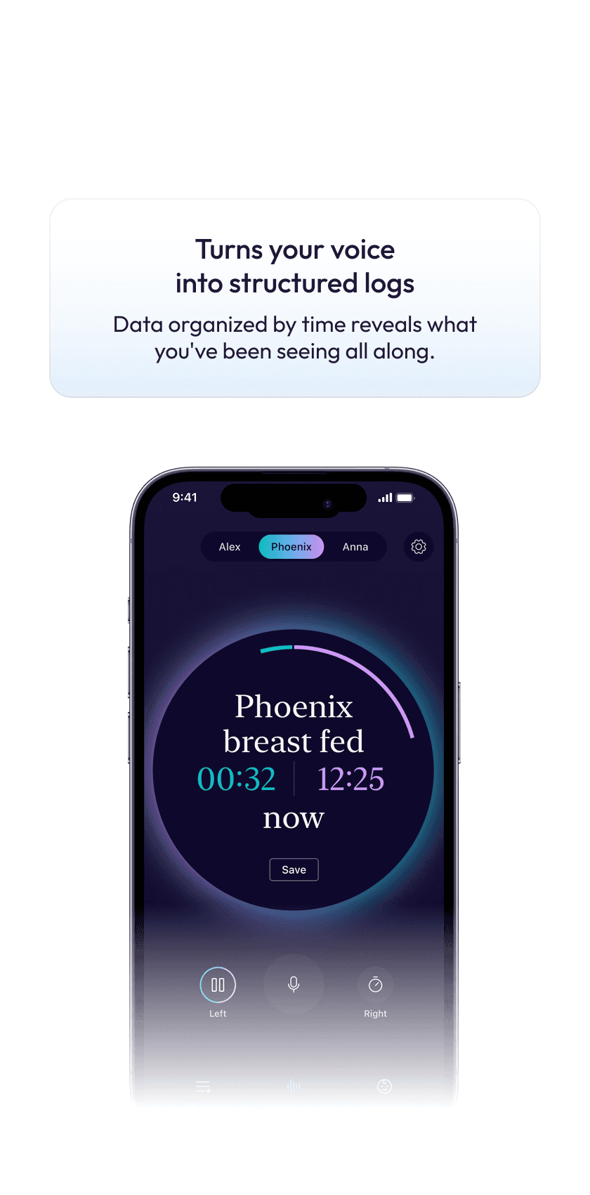 Use voice or quick taps for anything; naps, feeds, symptoms, diapers, meds, and more.