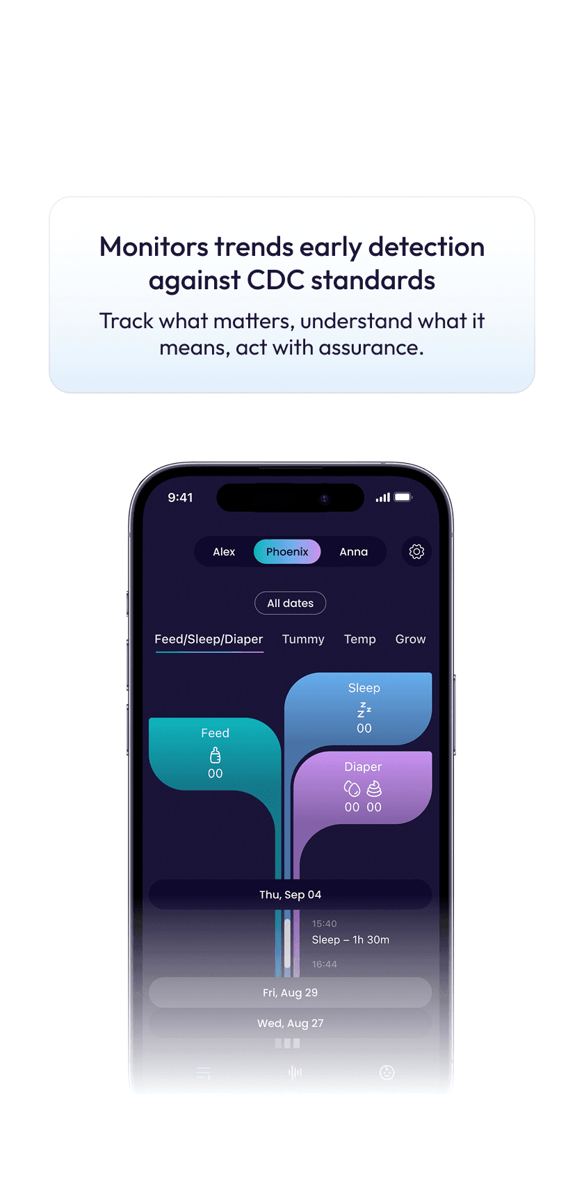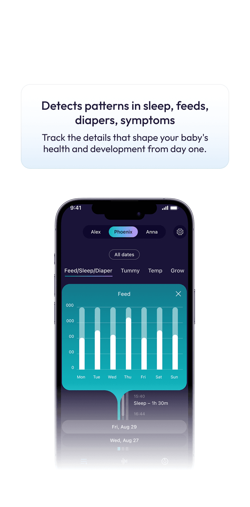 Detects patterns in sleep, feeds, diapers, symptoms