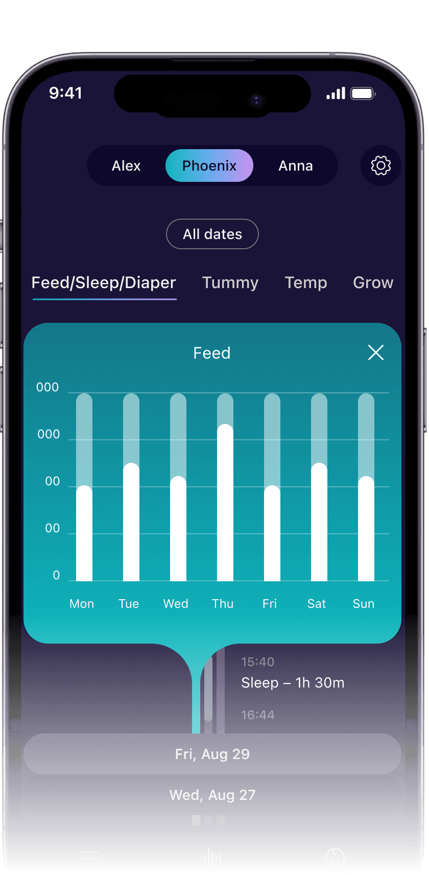 Captures feeds, meds, naps, and more instantly and on-the-go . No fumbling with complex menus, no tapping, and no bright phone screens waking the baby.